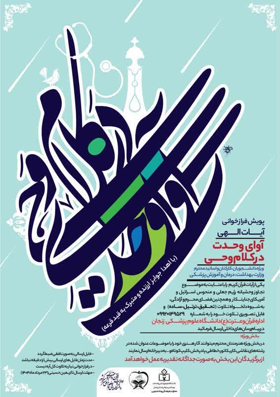 -دریافت آثار از طریق پیام رسان های داخلی به شماره 09920149529 اداره قرآن و عترت دانشگاه علوم پزشکی زنجان بخش ویژه: هنرمندان محترم میتوانند آثار هنری خود را به موضوعات عنوان شده در رشته های نقاشی،کاریکاتور،خطاطی،پادپخش،کلیپ کوتاه و ... به دبیرخانه ارسال نمایند